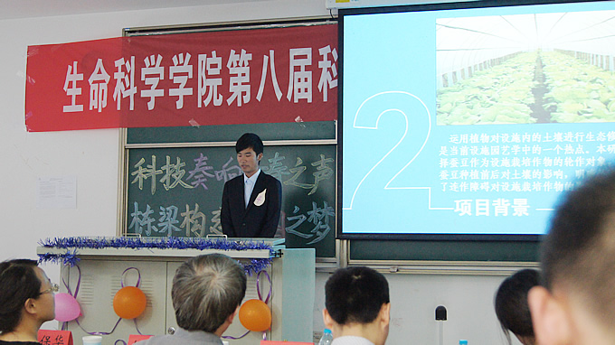 本次活动共有23件作品报名参赛,经过初赛、决赛预答辩,其中《樟树叶提取液的抑菌作用研究结果》、《黄萎病胁迫下棉花差异性研究》、《利用纤维素酶降解玉米秸杆的初步研究》等9件作品进入决赛。决赛主要分为ppt展示与问题答辩两个环节。决赛过程中,选手们本着科学严谨的态度用简明易懂的语言逐步呈现自己的实验课题,沉着地应对评委的专业提问,他们的精彩表现得到了评委老师的肯定,赢得观众的阵阵掌声。最后《蚕豆参与设施栽培连坐障碍修复技术研究》课题组摘得桂冠。