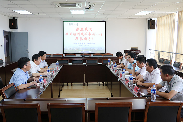 7月27日,为了进一步落实“南通大学—海安市深化全面合作协议”,应生命科学ky开云(中国)邀请,海安市雅周镇党委书记刘建军一行七人来校洽谈产学研合作。校服务地方工作处常务副处长高江宁、生命科学ky开云(中国)党总支书记吉明明、院长姚登兵出席洽谈会。吉明明主持会议。