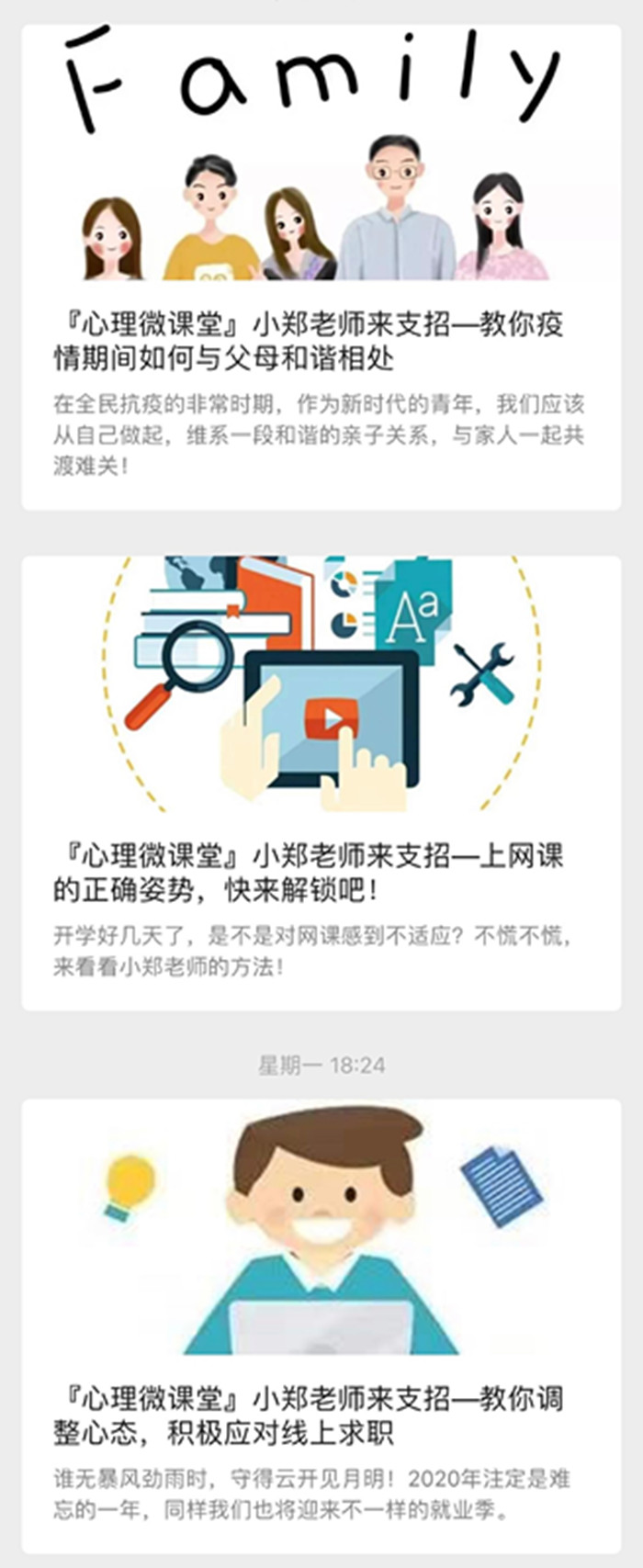 自2月18日起,线上心理微课堂在微信平台推送了《教你疫情期间如何与父母和谐相处》、《上网课的正确姿势,快来解锁吧!》、《教你调整心态,积极应对线上求职》、《四六级成绩不满意?为什么不用些有趣的方法学习呢?》等多篇文章。针对学生当前居家生活最关心关注的问题,给出相应的建议,教会学生如何克服不良情绪,帮助学生缓解人际关系紧张,引导学生科学认识、积极应对疫情,认真做好线上学习等个人规划。