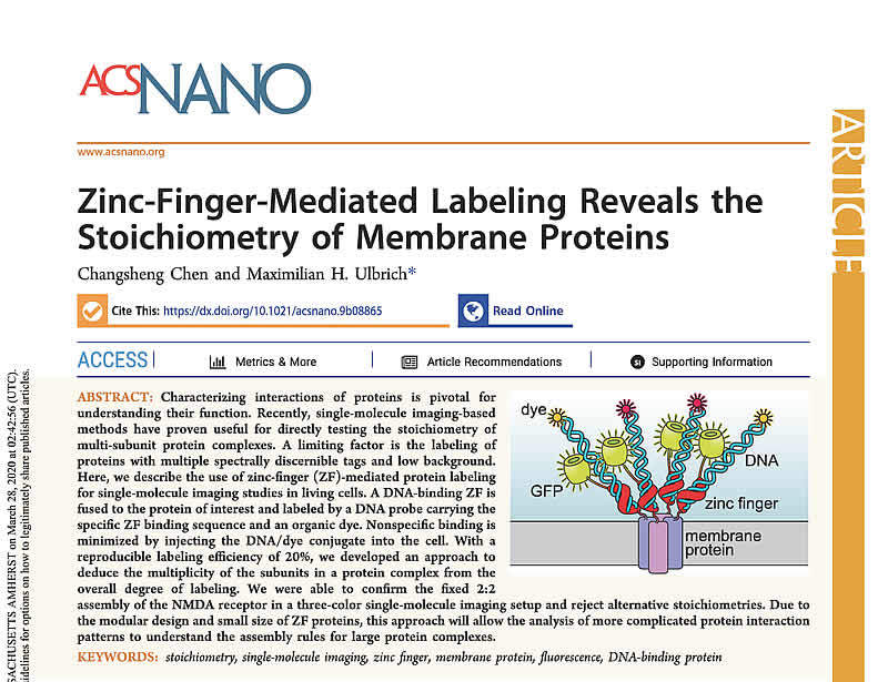 近日,生命科学ky开云(中国)青年教师陈昌盛博士在《ACS Nano》期刊上以南通大学为第一单位发表了题为《Zinc-Finger-Mediated Labeling Reveals the Stoichiometry of Membrane Proteins》的学术论文。《ACS Nano》是美国化学学会ACS旗下材料科学领域的Top期刊,中科院JCR分区为一区,影响因子为13.903