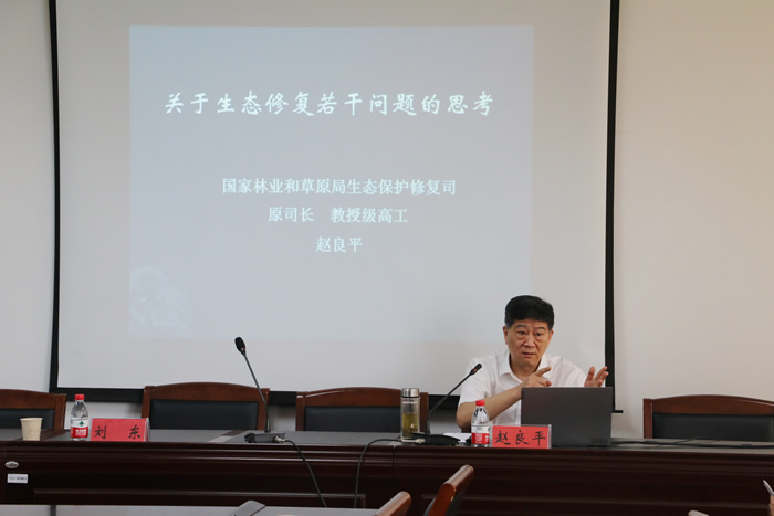 赵良平副会长为我院师生做了为《关于生态保护修复若干问题的思考》专题报告。他结合其多年担任国家林业和草原局生态保护修复司司长的工作经验,与师生共享了国家生态治理要求、生态系统修复与水资源利用、植被品种的本地化和多样化以及人类生态健康等方面的理论知识,并提出师法自然、城乡差别化个性化等科学生态观点。
