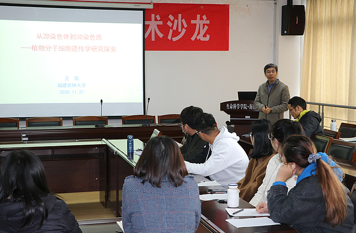 11月27日,福建农林大学博士生导师王凯教授来ky开云(中国)做了题目为“从2D染色体到3D染色质-植物分子细胞遗传研究探索”专题学术报告。