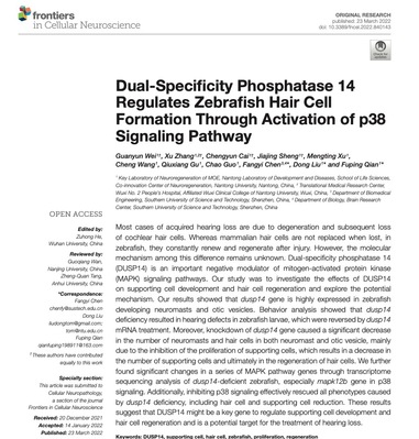 七、听力的丧失往往是随着毛细胞损伤,成年哺乳类动物的毛细胞无法再生,而斑马鱼等物种的毛细胞可以再生,这种差异的分子机制尚不明确。dusp14是MAPK信号通路的调控因子,研究表明,dusp14表达的缺失引起了p38信号通路的过表达,使得支持细胞增殖数量减少而引起毛细胞的缺失,最终影响斑马鱼的听力,可见dusp14是调控支持细胞和毛细胞再生的关键基因,是治疗听力损失的潜在靶点。相关研究于2022年3月发表在《Frontiers in Cellular Neuroscience》。
