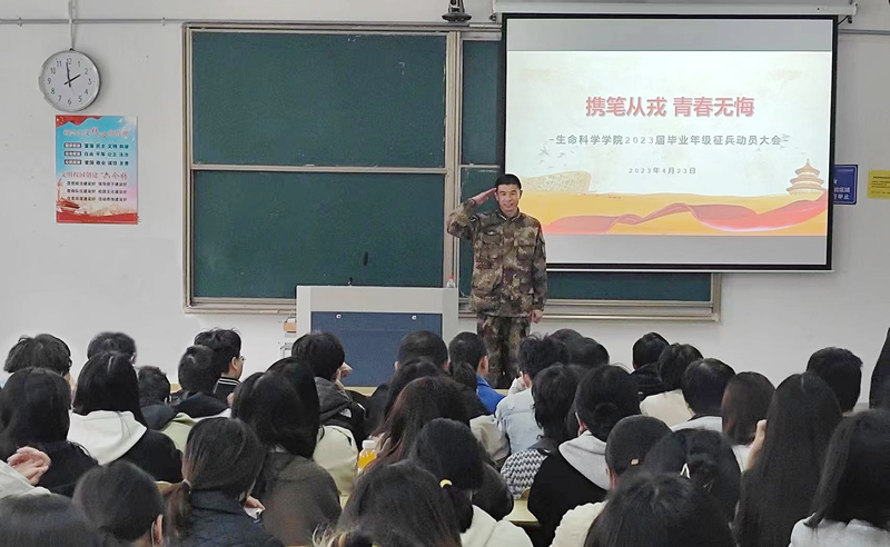 4月23日下午,生命科学ky开云(中国)召开2023届毕业生年级征兵动员大会暨基层就业政策宣讲会。校人武部张青国老师应邀作征兵政策宣讲。