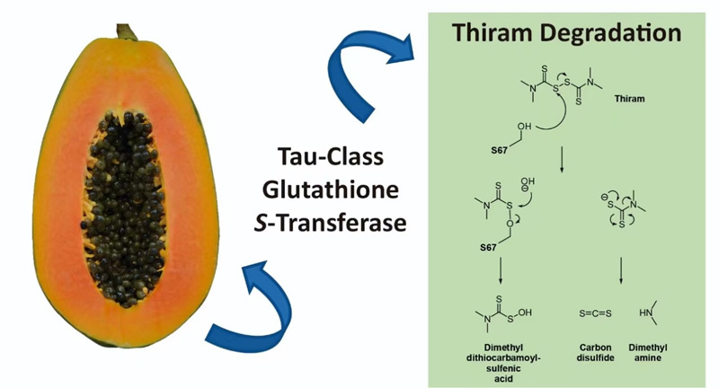 杀菌剂可以保护水果免受真菌的侵染。众所周知,大多数杀菌剂在施用后会在果皮中降解,但是有关这种降解过程涉及的物质、降解机制及产物尚不明确。本研究从木瓜果皮中克隆、鉴定出一种tau类谷胱甘肽S-转移酶(TCpGST),发现该酶对福美双、百菌清和噻菌灵均具有降解效果。通过定点突变和高效液相色谱分析鉴定出TCpGST中参与降解的关键氨基酸残基为G位点的S67。进一步通过LC-MS/MS以及GC-MS分析,证明TCpGSTS67将福美双降解为二硫化碳和N,N-二甲基氨基二硫代甲酸。此外通过使用GST选择性抑制剂NBD-Cl,木瓜皮中福美双的降解活性降低了95%,表明GST是福美双降解的主要酶类。本研究首次从水果中鉴定出能够降解农药的关键酶,并解析了该酶催化福美双降解的作用机制,阐明了福美双在木瓜果皮中的降解途径,有助于我们了解杀菌剂在水果中的去向和产物的生成过程。本研究为降低果蔬中的农药残留提供了新策略。研究得到了国家自然科学基金的支持。
