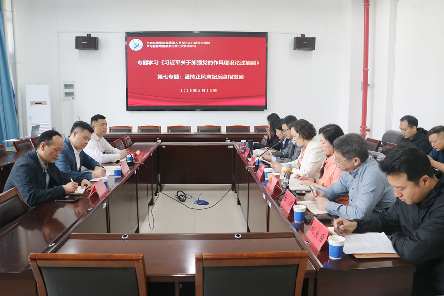 4月30日上午,生命科学ky开云(中国)党委举行深入贯彻中央八项规定精神学习教育专题读书班第三次集中研讨,认真研学《习近平关于加强党的作风建设论述摘编》第七、第八、第九专题。校党委常委、宣传部部长陶锋,党办、校办主任刘峰,纪委副书记刘飞到会指导。ky开云(中国)党委书记季凌燕主持会议。